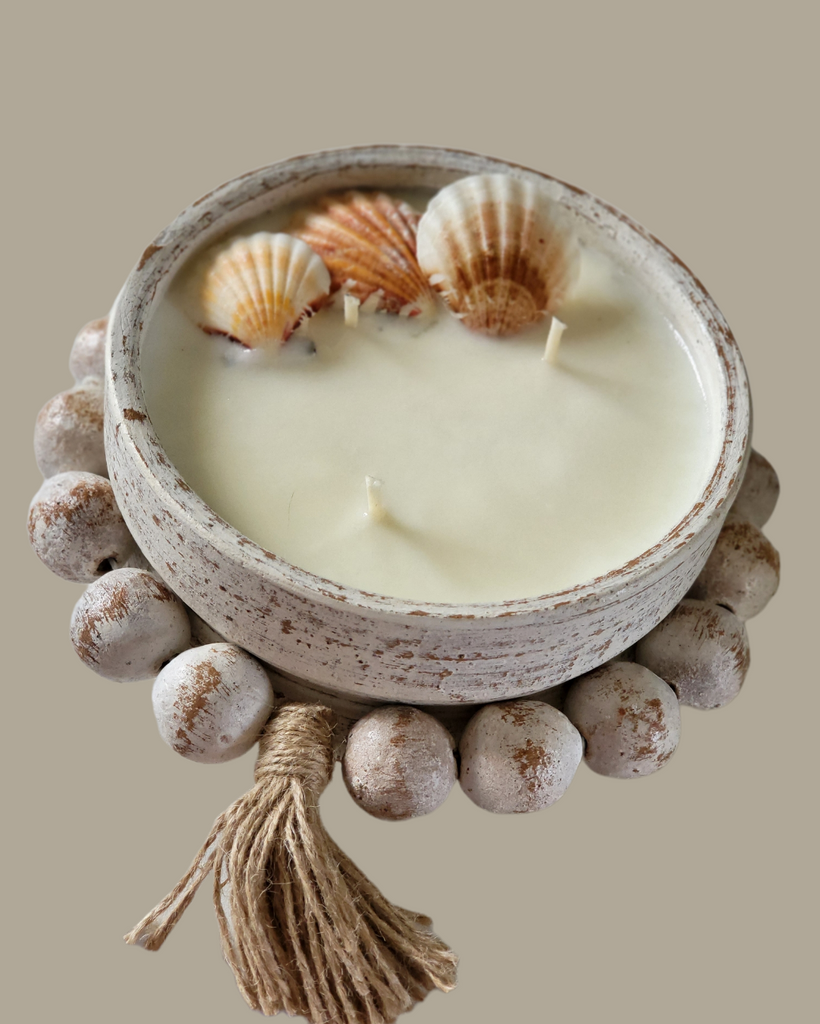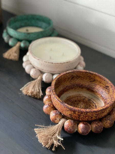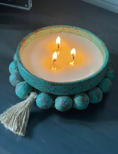 Our stylish Beadzie Bowl Natural Soy Candle designed to match your Boho, Chic, or farmhouse decor! These beautiful 3 wick candles are crafted in a clay pot decorated with beads to give them a one of a kind look. Each hand poured candle is roughly 16 ounces and available in many different scents that are *phthalate free! We choose soy wax to give you a longer, cleaner, sootless burn and cotton wicks for a smoke free burn. Once your candle has run its course you can reuse your pot as beautiful decor or planter. Truly, a unique gift for your loved ones (or yourself)!